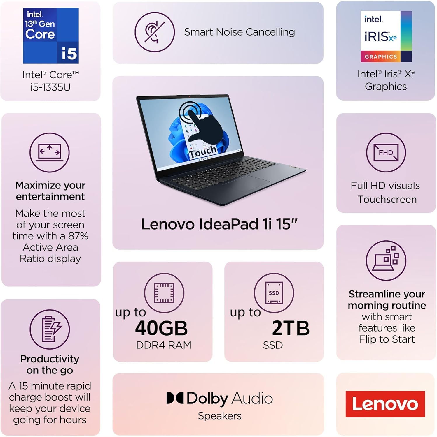 The IdeaPad 1 is exactly what you need in an everyday use laptop. Watch shows on an expansive 15.6″ FHD (1920×1080) In-Plane Switching (IPS) 300nits Anti-glare, Touchscreen display with a razor-thin frame. Backed by integrated Intel Iris Xe graphics for a clean and smooth picture. Listen to rich and clear audio from two Dolby Audio speakers. And with a battery that lasts all day and charges super-fast, you can work from anywhere while enjoying clear video calls with Smart Noise Cancelling.